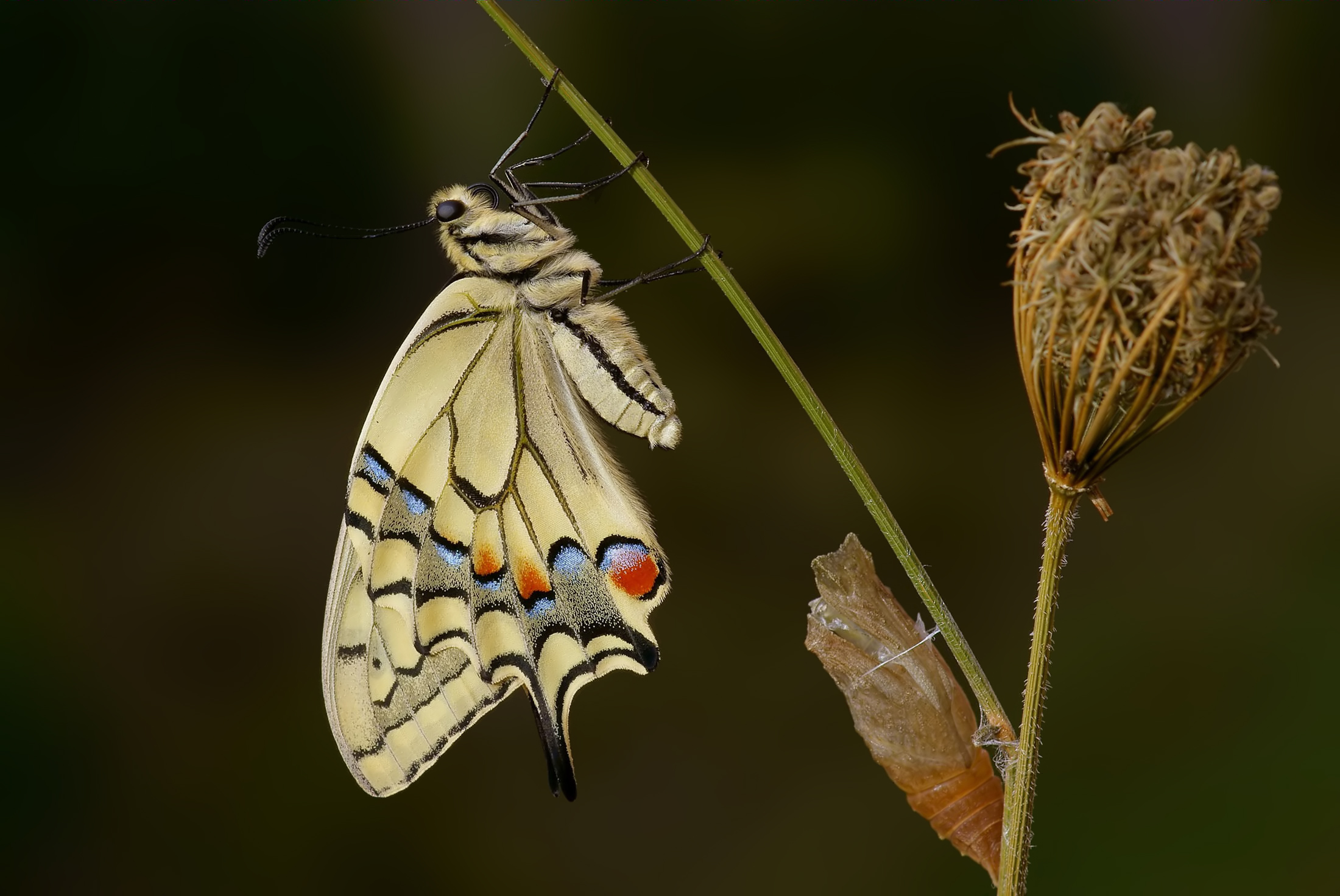 Frisch geschlüpfter Schwalbenschwanz mit seiner Gürtelpuppe und der Futterpflanze